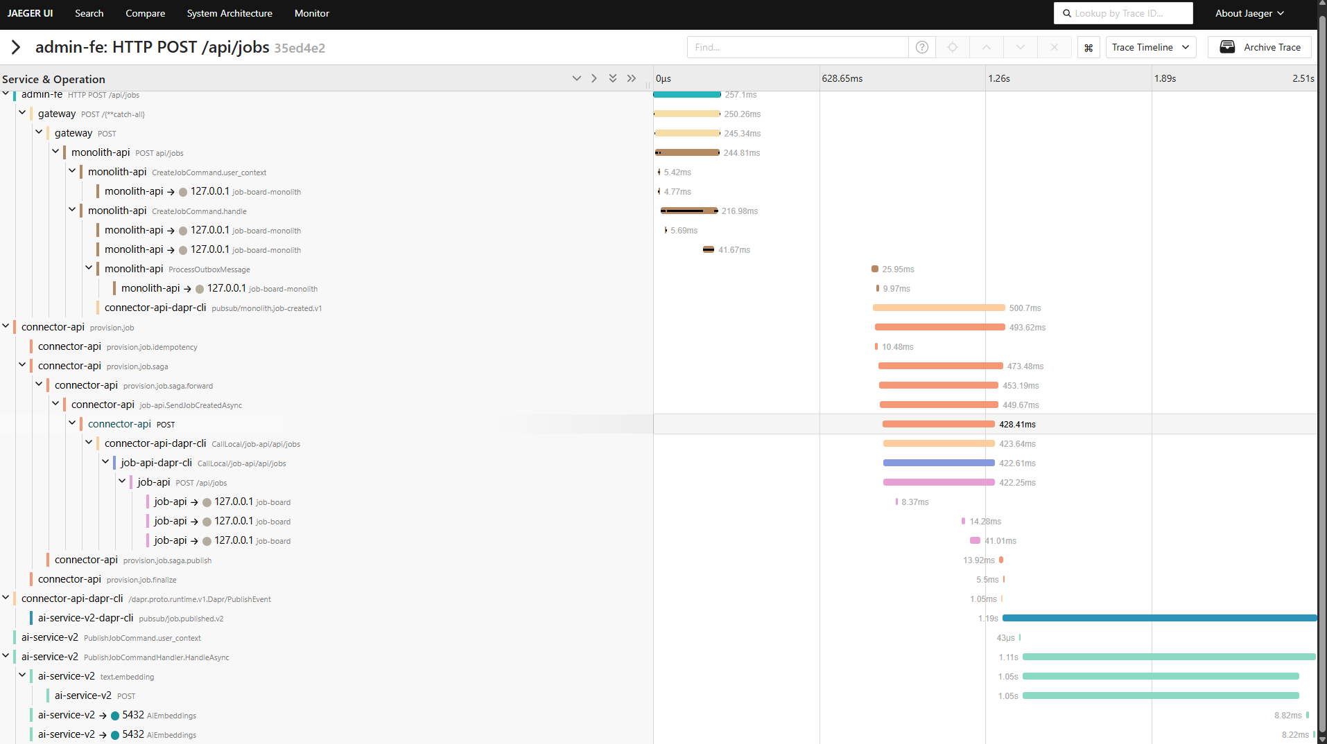 Click "Create Company" in the admin app. The API response includes a TraceId header. Click the Jaeger link in the admin toolbar. You'll see the full trace: gateway to monolith, outbox dispatch, connector saga fanning out to three microservices, reverse connector syncing back.