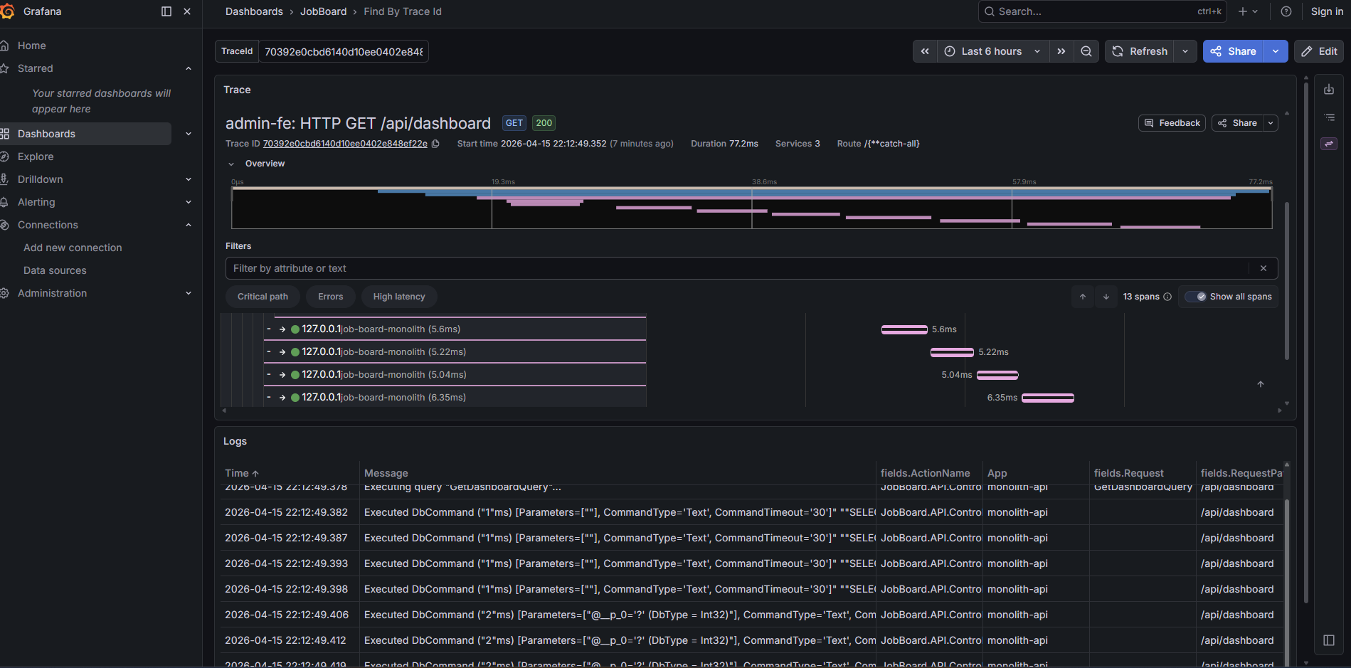 Open Grafana and check the API dashboard. You'll see request latency percentiles, error rates by endpoint, and throughput over time. Filter by TraceId to correlate a specific request's metrics with its trace. Click into a trace span and Grafana shows the structured logs from that service in context — no context switching between tools.