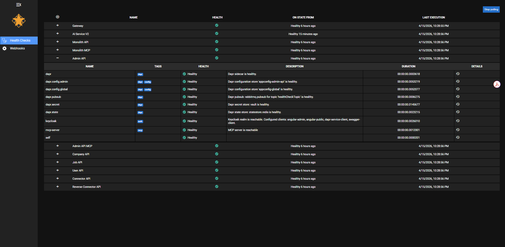 The health checks dashboard shows the status of every service at a glance. Expand any service to see its individual checks: Dapr sidecar connectivity, pub/sub topic health, config store availability, secret vault access, Keycloak realm reachability, and MCP server status. Each check reports independently — you can tell the difference between "the service is up but can't reach Redis" and "the service is down."